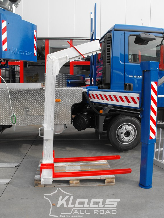 Nouvelle fourche à palettes réglable pour grue tractable et camion grue Klaas. Capacité de charge encore plus élevé, jusqu'à 1500 kg. Fourche à palettes réglable en aluminium ajustable pour les artisans charpentiers, couvreurs.