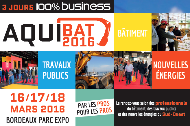 AQUIBAT 2016, c’est l’évènement incontournable du printemps pour toute la filière construction de la région Sud-Ouest, le rendez-vous des artisans du bâtiment, des constructeurs, des promoteurs, des maîtres d’ouvrage ou maîtres d’œuvre !