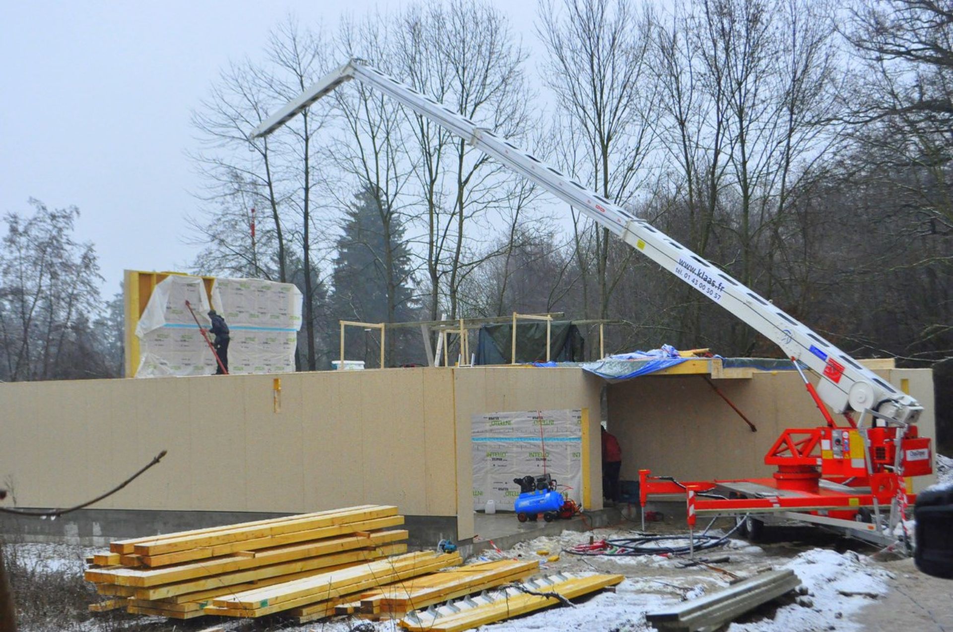 Pour la réalisation des couvertures et des extensions en ossature bois, une entreprise spécialisée dans la construction de maisons basse consommation louait un chariot élévateur avec une flèche de 10 mètres. En raison de sa faible portée, le chariot élévateur devait être déplacé en périphérie d'ouvrage, ce qui créait des ornières et nécessitait une remise en état des abords du bâtiment en fin de chantier, donc des frais supplémentaires. - Solution :