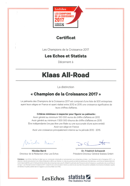 Klaas All Road fait partie de ce classement et a été nominé « Champion de la Croissance 2017 »*.