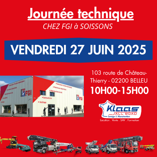 De 10h à 15h, retrouvez notre équipe sur place pour découvrir en démonstration une grue sur remorque 100 % électrique Klaas. Compacte, silencieuse et propre, cette solution innovante est idéale pour les chantiers urbains ou en zone sensible.