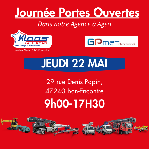 Nous vous invitons à notre Journée Portes Ouvertes à l’agence d’Agen pour une journée dédiée à la découverte et aux démonstrations de nos matériels de levage.