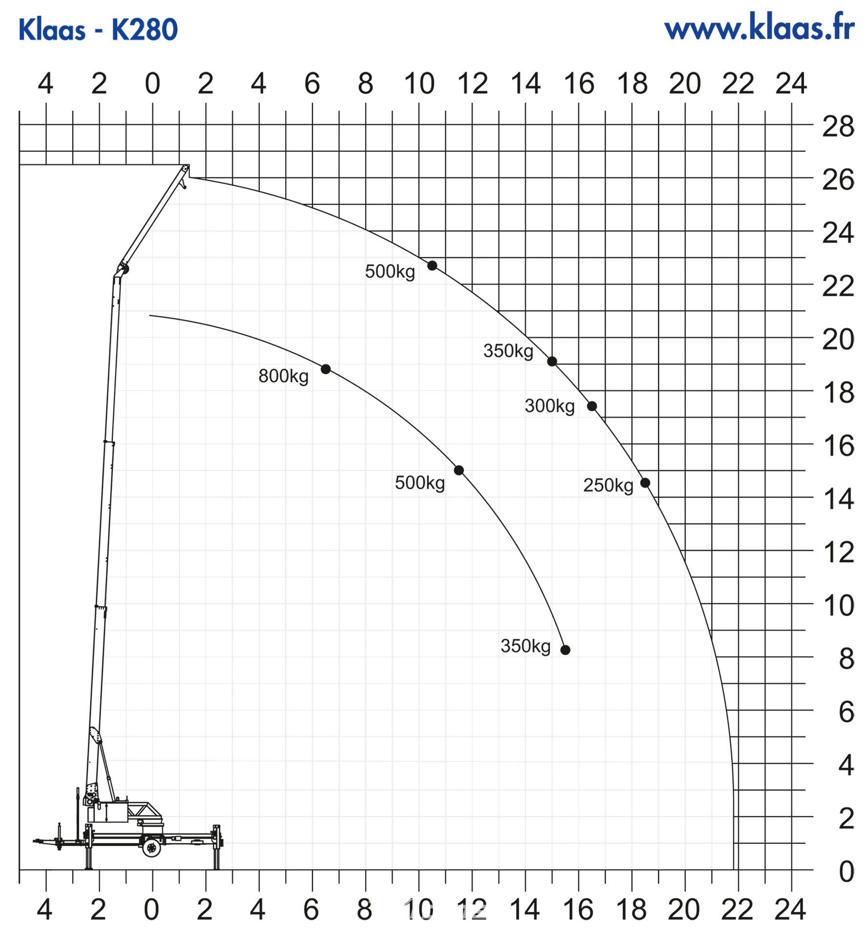 Sa hauteur de crochet est de 25,5 m, la portée avec une charge de 250 kg est de 18,50 m. Avec une hauteur de flèche d'environ 22 m, le K280 peut également atteindre les faces arrière des immeubles de plusieurs étages sans avoir à déplacer la grue.