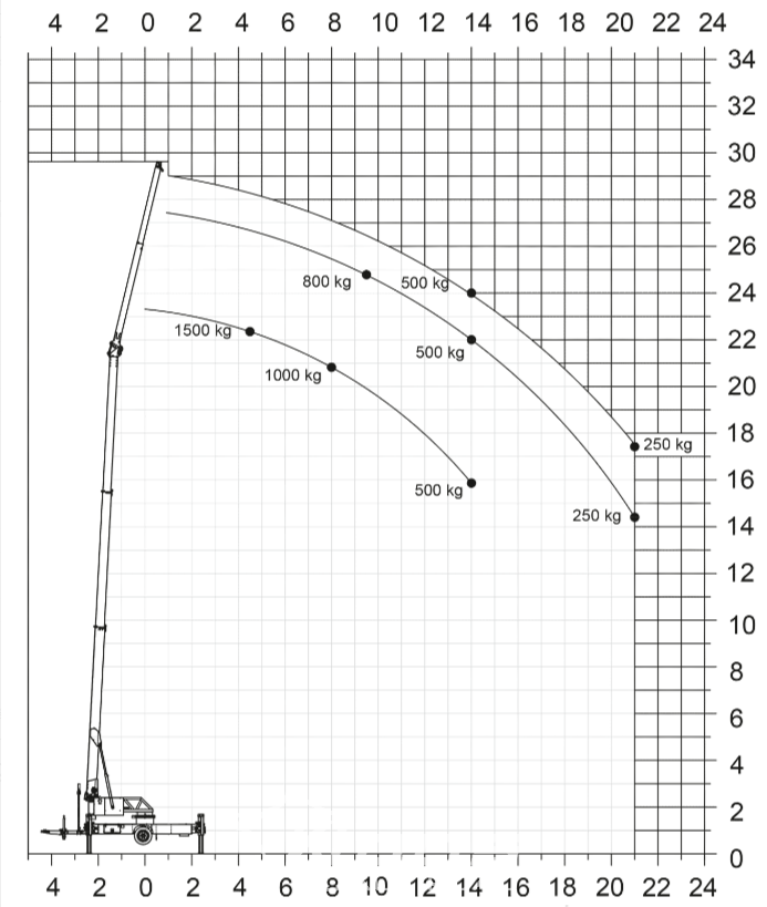 La hauteur du crochet de cette grue sur remorque, dont la charge tractable est de 3,5 tonnes, atteint environ 30 mètres. Son bras à flèche articulée permet de soulever des charges allant jusqu'à 1 500 kg.